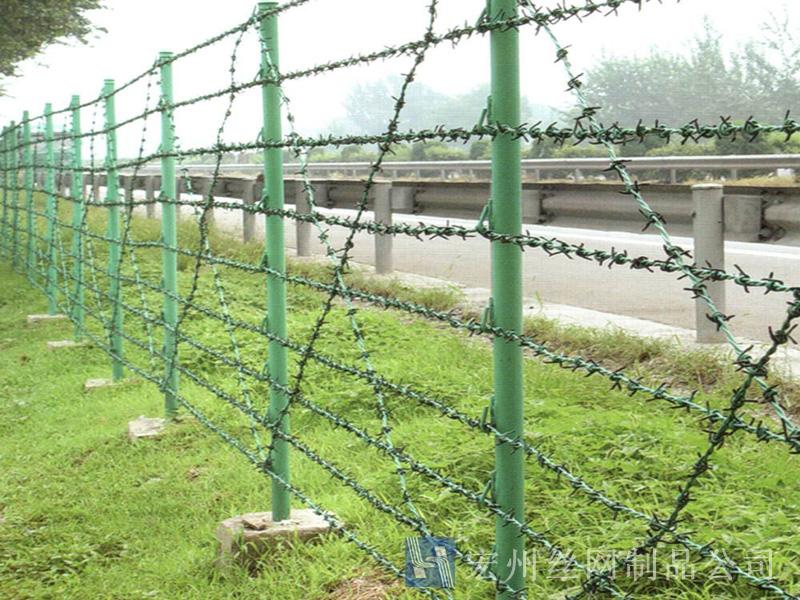 刺繩隔離網(wǎng),刺絲護(hù)欄網(wǎng),刺鐵絲隔離柵,刺繩護(hù)欄網(wǎng),鍍鋅刺網(wǎng)。宏州護(hù)欄網(wǎng)廠生產(chǎn)的產(chǎn)品主要分鍍鋅,浸塑兩種,是以立柱加刺繩制作而成, 刺繩刺鐵絲。